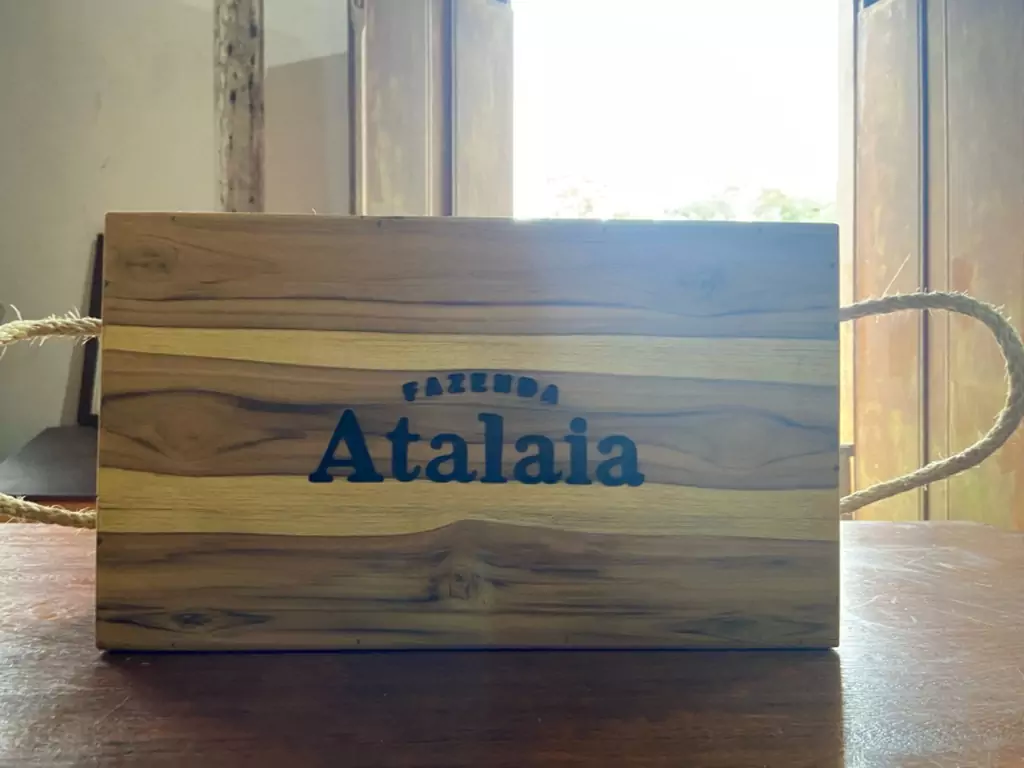 Caixa de presente de madeira elaborada por mestre Pedro Cesar (marceneiro e carpintero da Fazenda Atalaia).